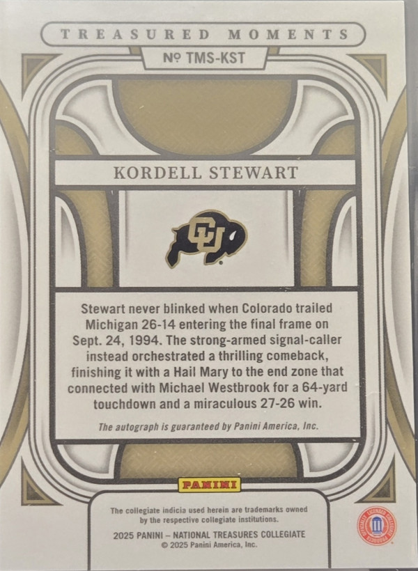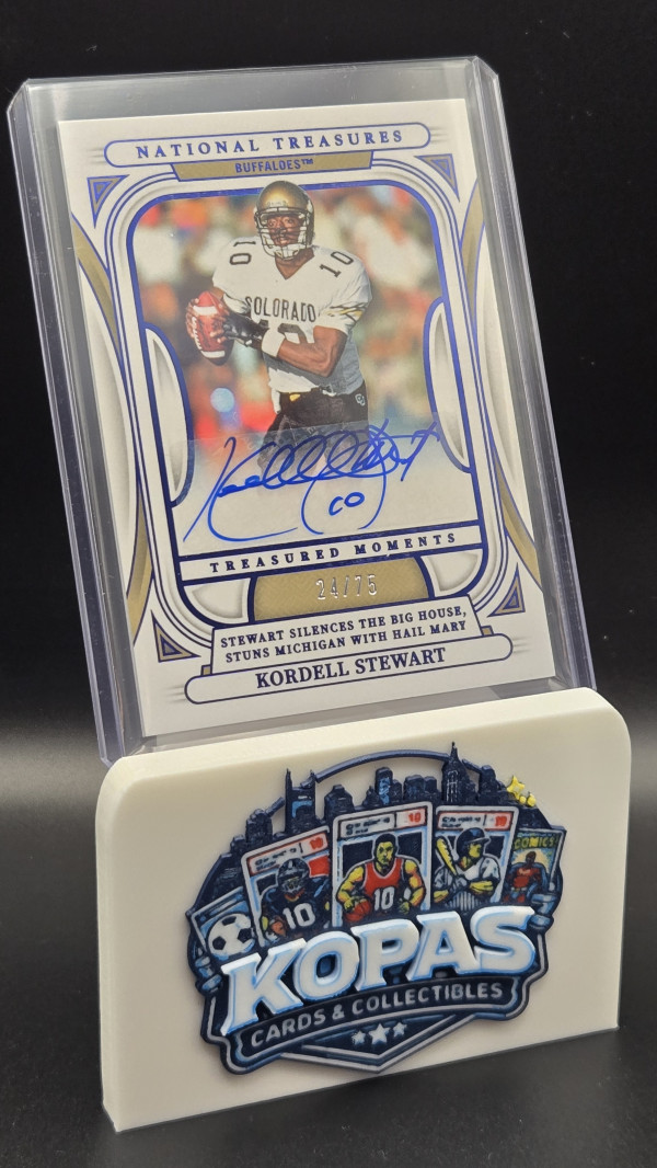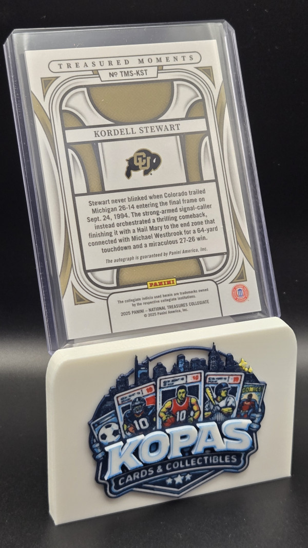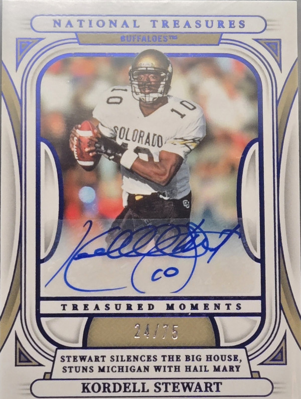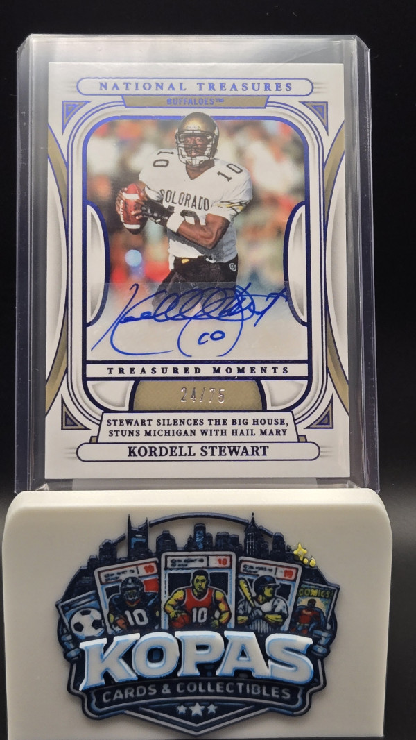 The product is a 2025 National Treasures Collegiate Treasured Moments Kordell Stewart Blue trading card, featuring an autograph from Kordell Stewart. This card is part of the 2025 Panini National Treasures Collegiate set and is part of the Treasured Moments Signatures insert set. It is a serial numbered original sports trading card with a print run of 75, making it a rare and valuable collectible for fans of football and the Colorado Buffaloes.