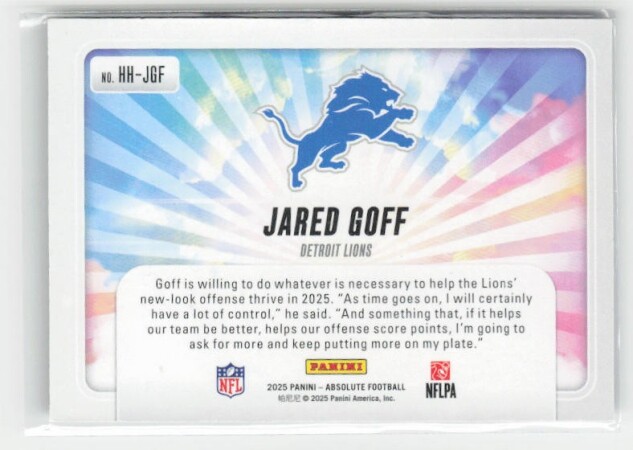 You are purchasing a 2025 Panini Absolute Jared Goff #HH-JGF Hog Heaven. You will receive the exact item in the photographs. Thank you for looking.