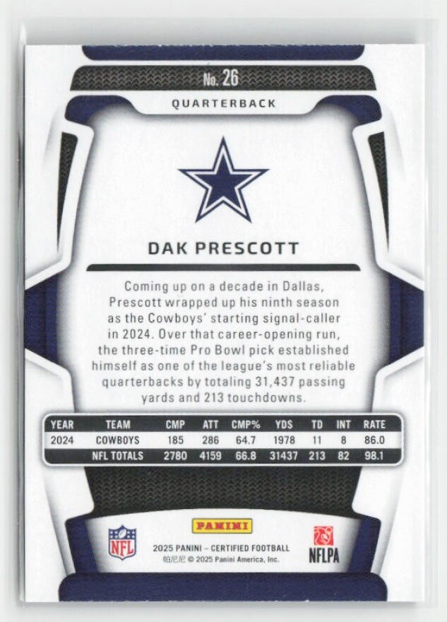 You are purchasing a 2025 Panini Certified Dak Prescott #26. You will receive the exact item in the photographs. Thank you for looking.