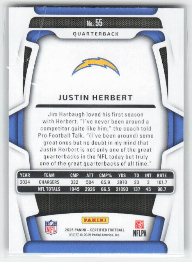 You are purchasing a 2025 Panini Certified Justin Herbert #55. You will receive the exact item in the photographs. Thank you for looking.