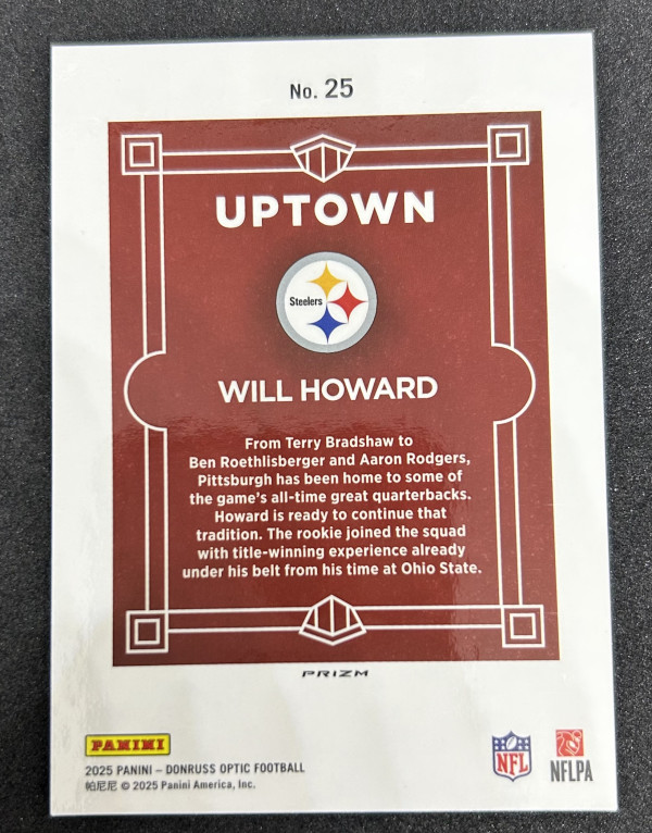 You are purchasing a 2025 Panini Donruss Optic Prizm Uptown Will Howard #25 RC. You will receive the exact item in the photographs. Thank you for looking.