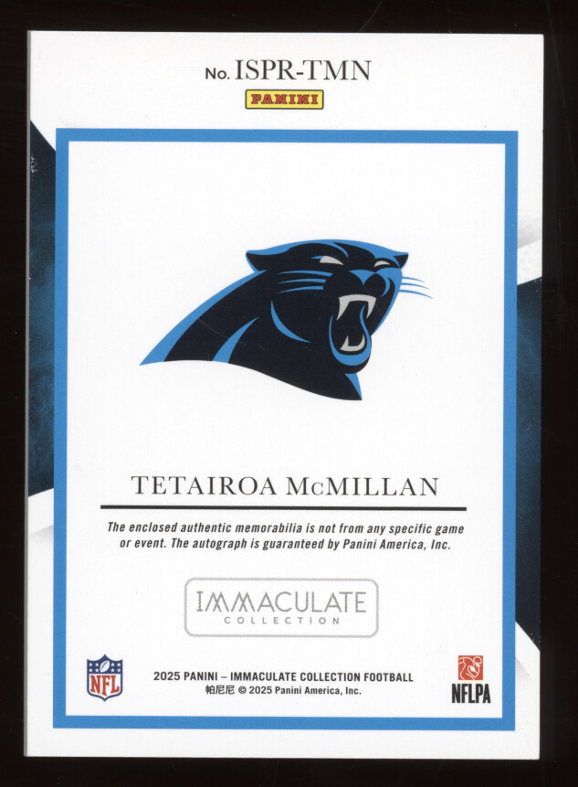 2025 Panini Immaculate Tetairoa McMillan #ISPR-TMN RC 13/99 Signature Patches