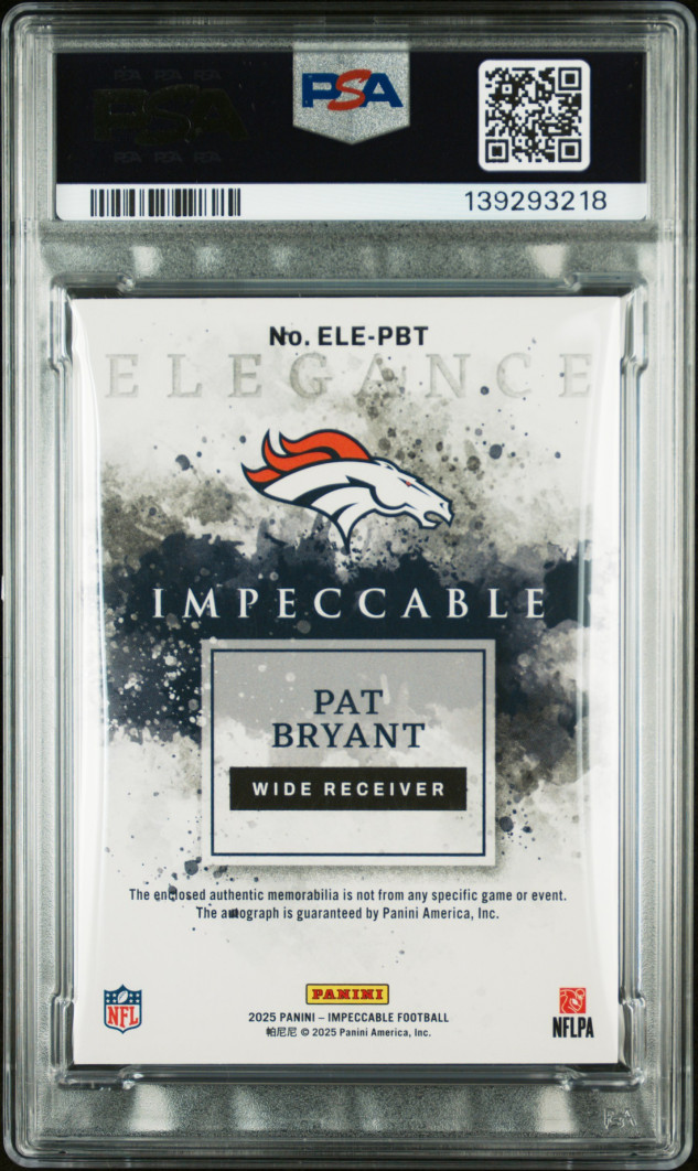 The 2025 Panini Impeccable Elégance Helmet-PatchAutos Pat Bryant#ELE-PBT/89AU,MEM,RC is a highly coveted sports trading card featuring an autograph from Pat Bryant. This hard-signed card is part of the 2025 Panini Impeccable set and is crafted with high-quality card stock. Graded by Professional Sports Authenticator (PSA) as a 8, this original sports trading card is a valuable addition to any football card collection. With its unique design and limited serial number, this card is sure to be a prized possession for collectors and fans alike.