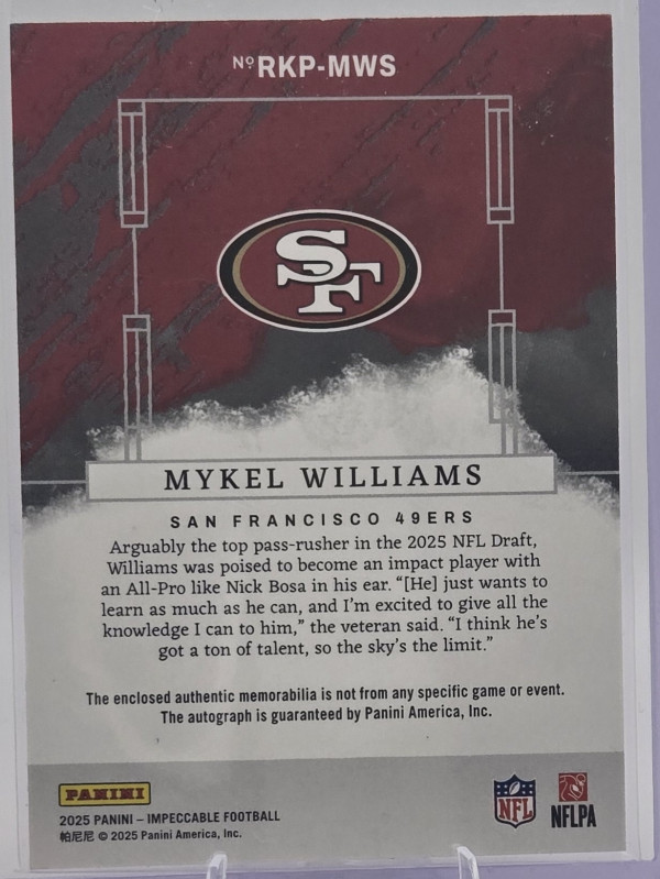 The product is a 2025 Panini Impeccable Mykel Williams Rookie Patch Auto Red /75 trading card featuring the autograph of Mykel Williams from the Tennessee Titans. This card is part of the Rookie Patch Autographs insert set and is authenticated by Panini Authentic. The card is serial numbered, making it a rare collectible for football fans and trading card enthusiasts. With only 75 copies in existence, this limited edition card is a valuable addition to any sports memorabilia collection.