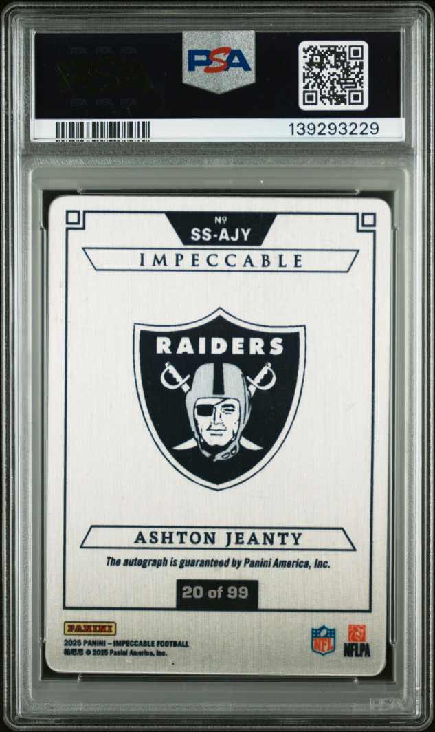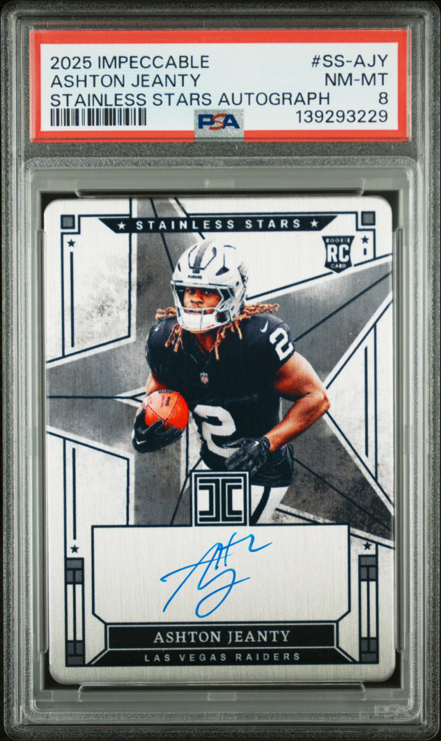 The product is a 2025 Impeccable Ashton Jeanty autographed trading card, limited to a print run of 99. This card features a hard-signed autograph from the National Football League player, making it a valuable addition to any sports trading card collection. With a grade of 8 from Professional Sports Authenticator (PSA), this card is in near mint condition and comes with Panini Authentic autograph authentication, ensuring its authenticity and quality. The card is part of the 2025 Panini Impeccable set and is a sought-after item for football fans and collectors.