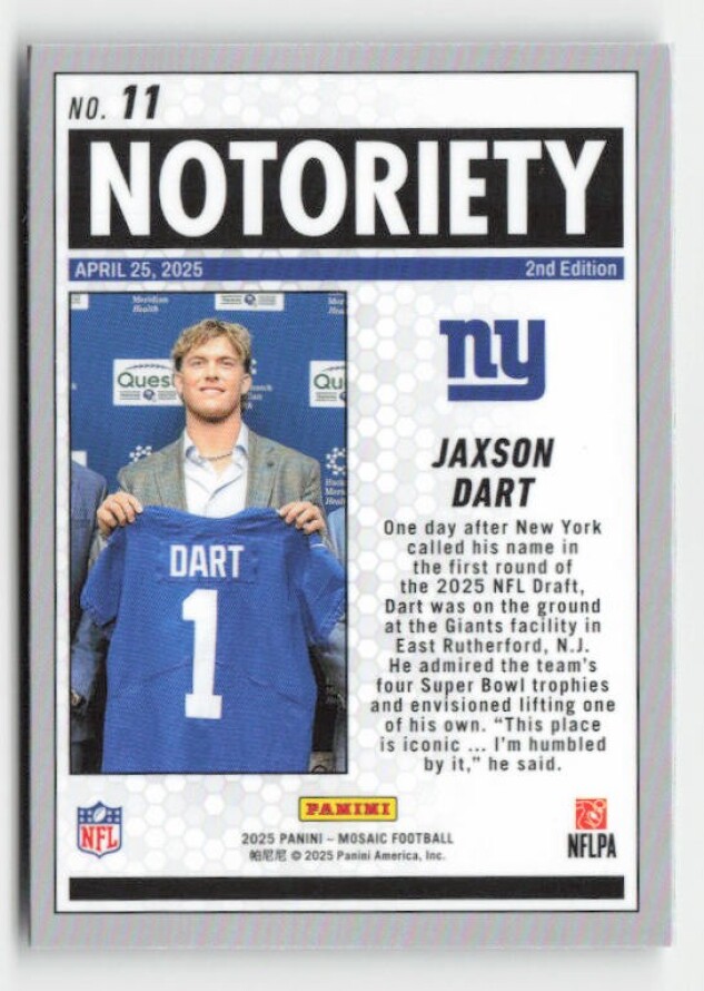 You are purchasing a 2025 Panini Mosaic Jaxson Dart #11 Notoriety. You will receive the exact item in the photographs. Thank you for looking.