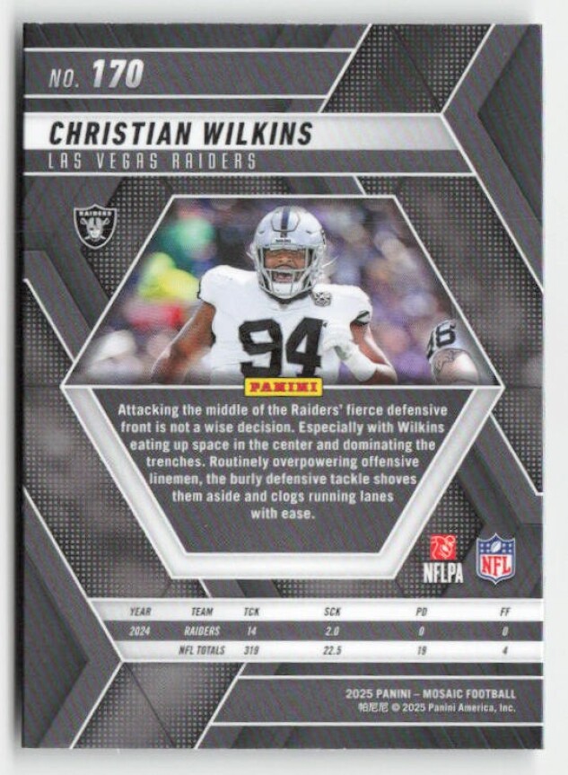 You are purchasing a 2025 Panini Mosaic Christian Wilkins #170. You will receive the exact item in the photographs. Thank you for looking.