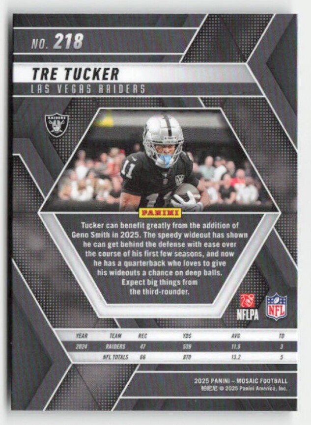 You are purchasing a 2025 Panini Mosaic Tre Tucker #218. You will receive the exact item in the photographs. Thank you for looking.