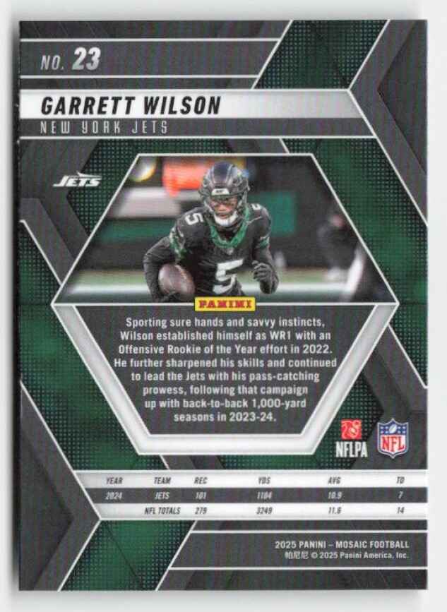 You are purchasing a 2025 Panini Mosaic Garrett Wilson #23. You will receive the exact item in the photographs. Thank you for looking.