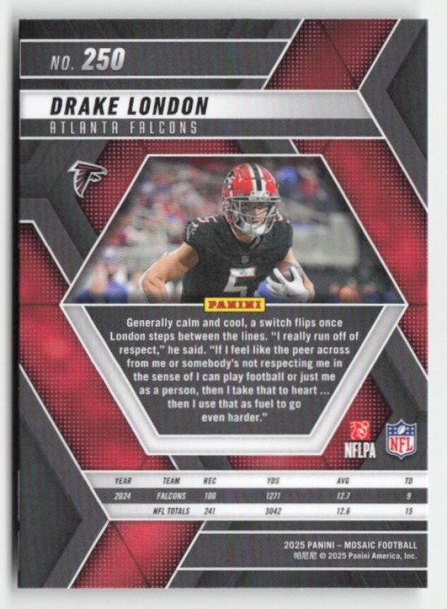 You are purchasing a 2025 Panini Mosaic Drake London #250. You will receive the exact item in the photographs. Thank you for looking.