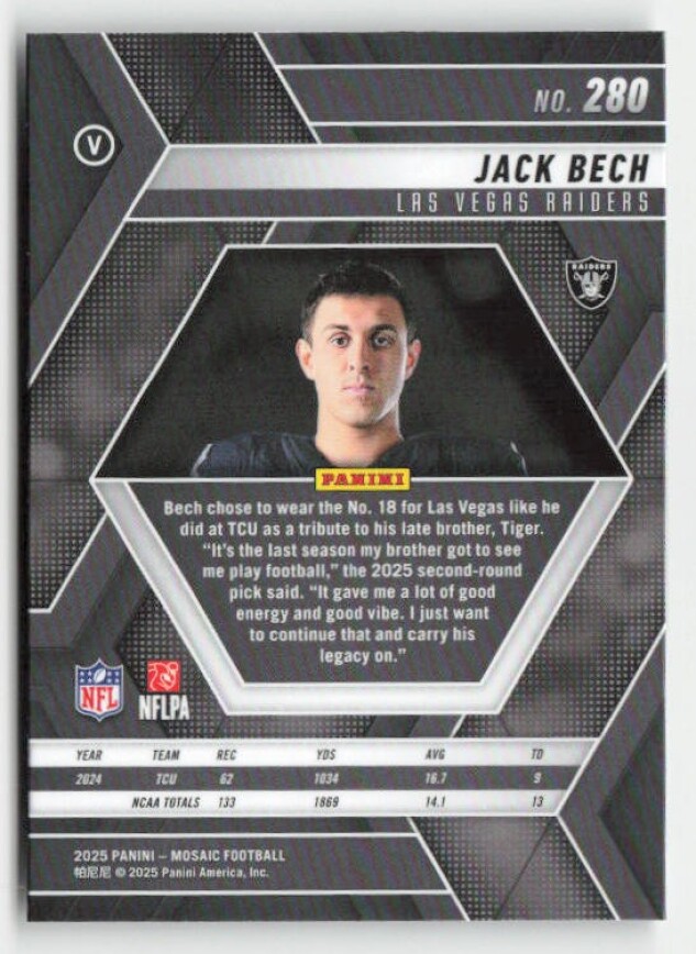 You are purchasing a 2025 Panini Mosaic Jack Bech #280 RC. You will receive the exact item in the photographs. Thank you for looking.