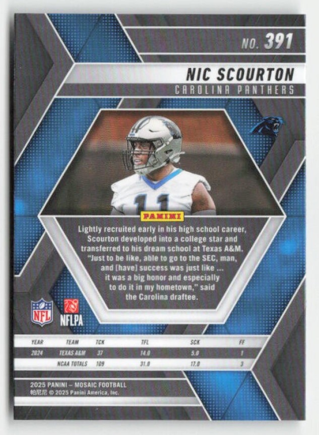 You are purchasing a 2025 Panini Mosaic Nic Scourton #391 RC. You will receive the exact item in the photographs. Thank you for looking.