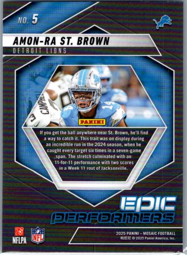This is a nice example of a 2025 Panini Mosaic #5 Amon-Ra St. Brown Epic Performers