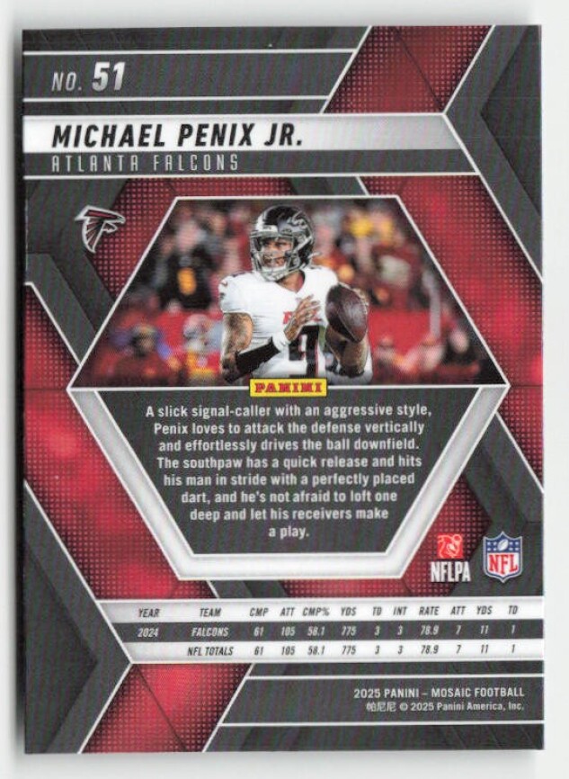 You are purchasing a 2025 Panini Mosaic Michael Penix Jr. #51. You will receive the exact item in the photographs. Thank you for looking.