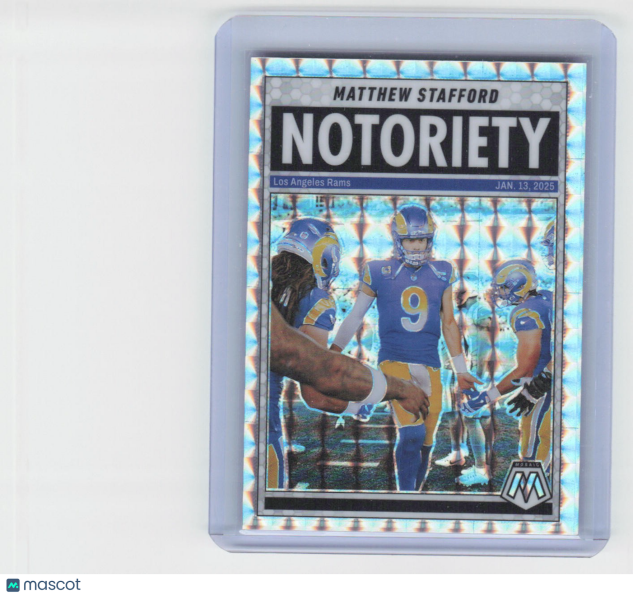 You are purchasing a 2025 Panini Mosaic Matthew Stafford #7 Notoriety Mosaic. You will receive the exact item in the photographs. Thank you for looking.