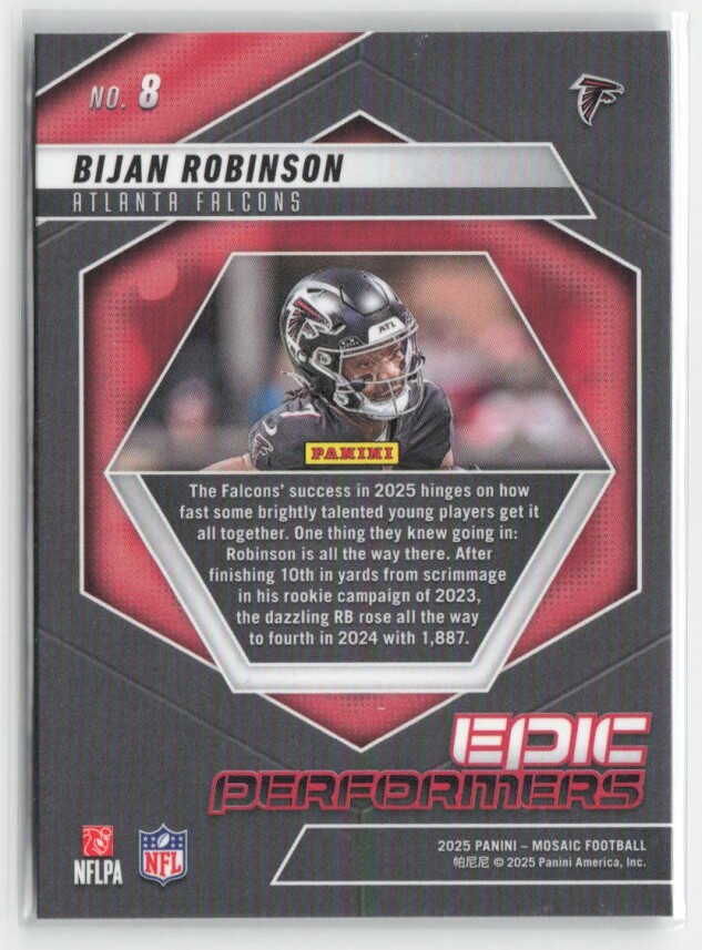 You are purchasing a 2025 Panini Mosaic Bijan Robinson #8 Epic Performers. You will receive the exact item in the photographs. Thank you for looking.