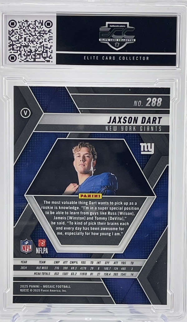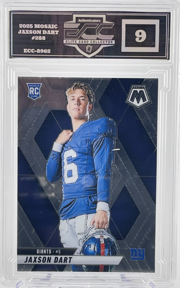 The 2025 Panini Mosaic Football Jaxson Dart Image Variation Rookie RC #288 card is a standard-sized sports trading card featuring rookie player Jaxson Dart from the New York Giants. This English-language card is manufactured by Panini and graded as a 9. It is a unique mosaic parallel variety with a 20 Pt. thickness, making it a sought-after collectible for football fans. The card is not autographed but is authenticated by Panini Authentic, adding to its value and appeal to collectors.