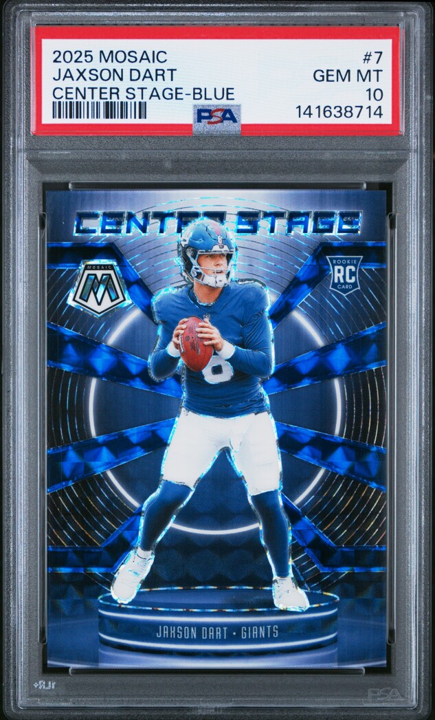 2025 Panini Mosaic Jaxson Dart Center Stage-Blue /99 PSA 10