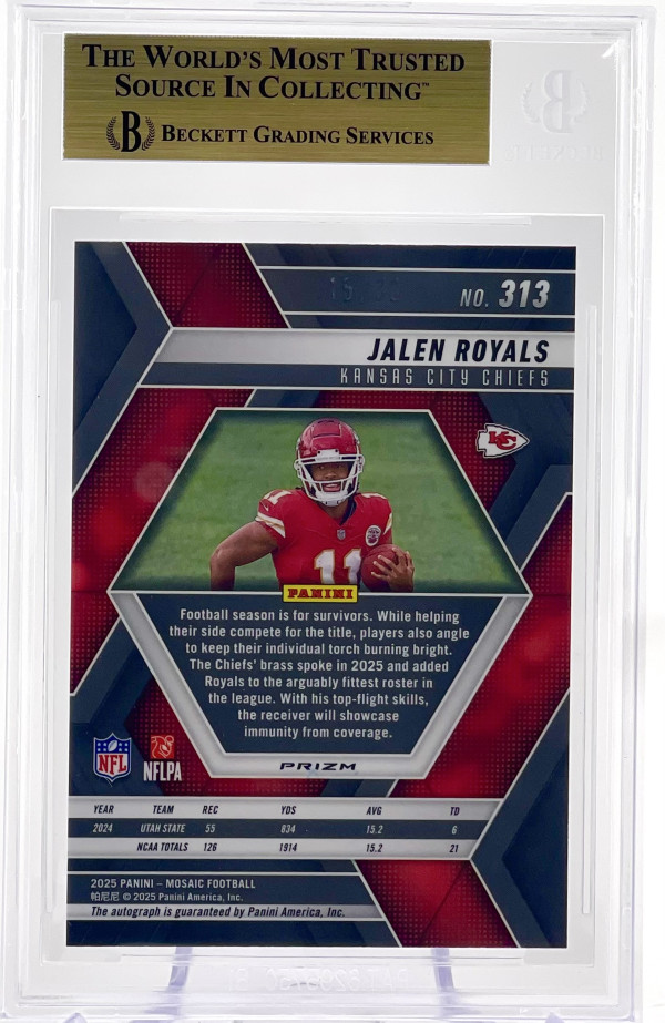 The 2025 Panini Mosaic Rookie Autographs trading card features Jalen Royals from the Kansas City Chiefs in the National Football League (NFL). This card is part of the Mosaic Pink Spectris FOTL set, with an autograph from Jalen Royals in the form of a label or sticker. #15/30 Manufactured by Panini and authenticated by Panini Authentic, this original sports trading card is made of card stock and is graded as a 9.5 by Beckett Grading Services (BGS). A valuable addition for fans and collectors alike, this card showcases the exciting rookie talent in the football world.