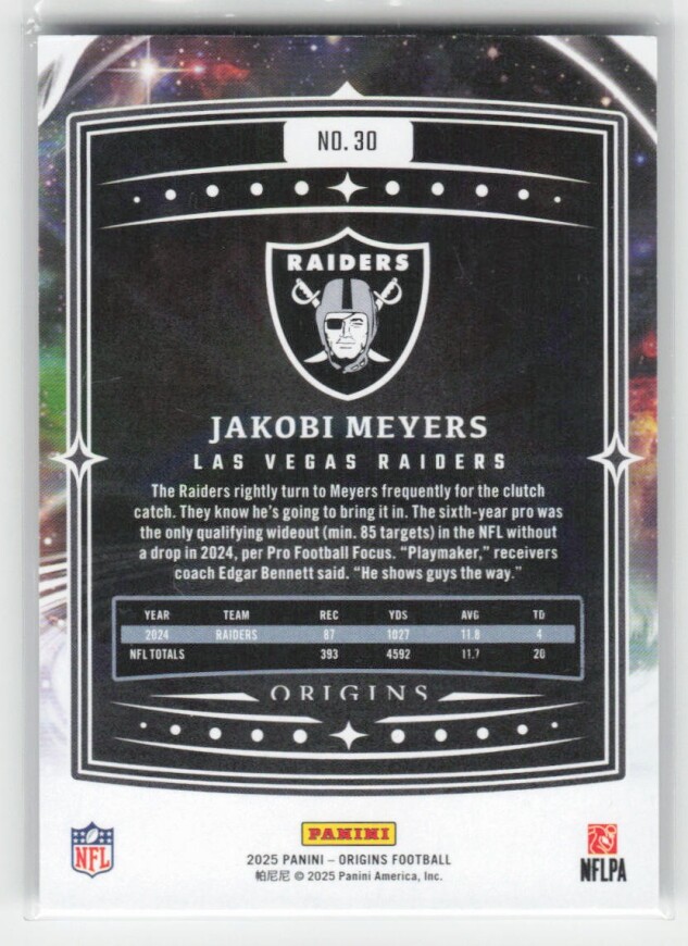 You are purchasing a 2025 Panini Origins Jakobi Meyers #30. You will receive the exact item in the photographs. Thank you for looking.