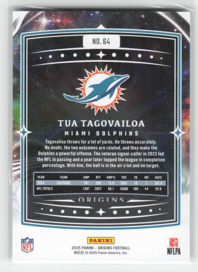 You are purchasing a 2025 Panini Origins Tua Tagovailoa #64. You will receive the exact item in the photographs. Thank you for looking.