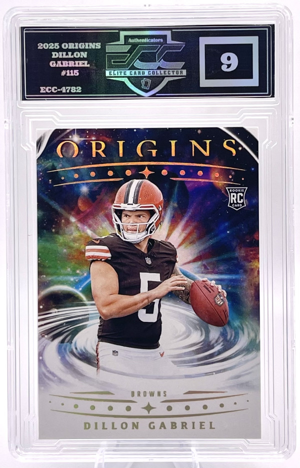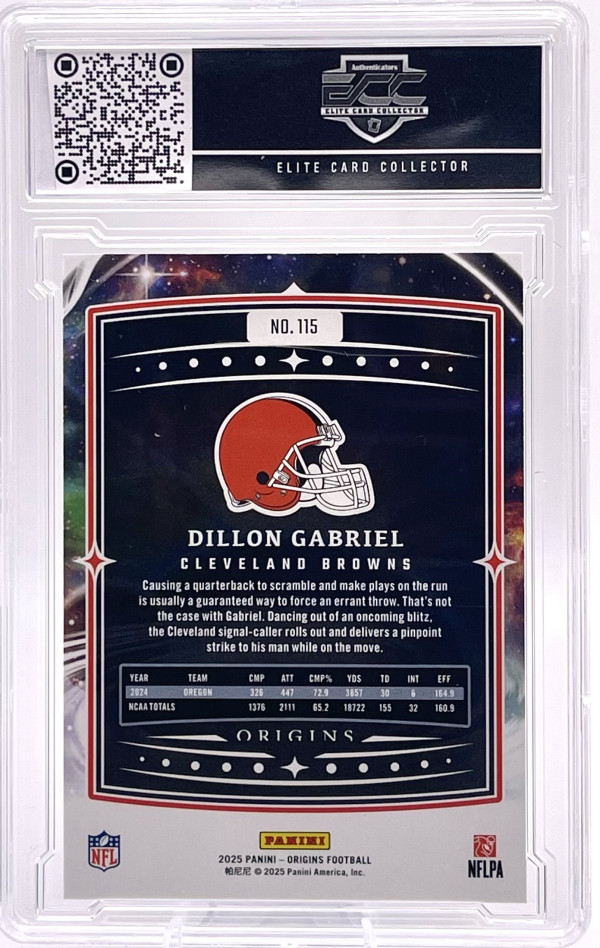 The product is a 2025 Panini Origins football trading card featuring rookie athlete Dillon Gabriel from the Cleveland Browns. This particular card is numbered #115 and is a Blue parallel with a limited print run of 99. It is a graded card with a grade of 9 and is part of the base set for the 2025 season. This sports trading card is a valuable collectible for fans of the National Football League (NFL) and collectors of rookie cards.