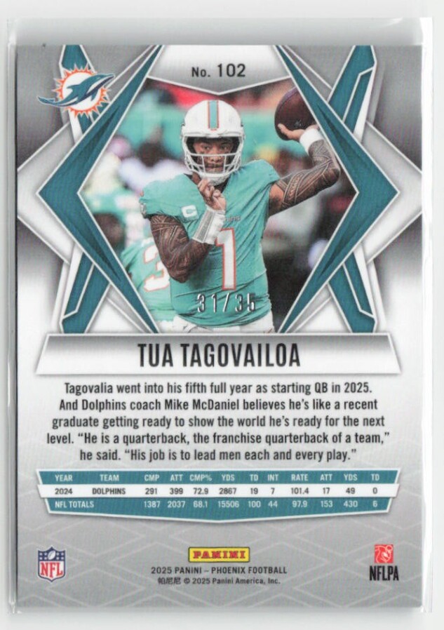 You are purchasing a 2025 Panini Phoenix Tua Tagovailoa #102 Blue Seismic Prizm SP SN 31/35. You will receive the exact item in the photographs. Thank you for looking.