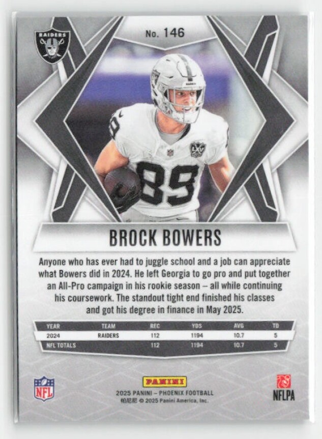 You are purchasing a 2025 Panini Phoenix Brock Bowers #146 Silver Pyramids Prizm. You will receive the exact item in the photographs. Thank you for looking.