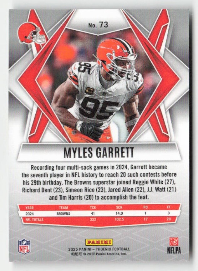 You are purchasing a 2025 Panini Phoenix Myles Garrett #73. You will receive the exact item in the photographs. Thank you for looking.