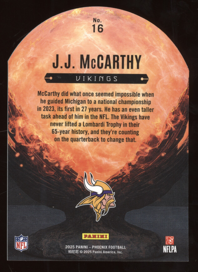 You are purchasing a 2025 Panini Phoenix Football Resurgent J.J. McCarthy #16. You will receive the exact item in the photographs. Thank you for looking.