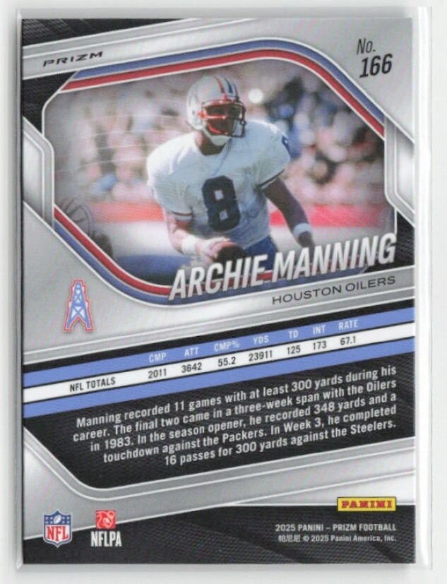 You are purchasing a 2025 Panini Prizm Archie Manning #166 Orange Ice. You will receive the exact item in the photographs. Thank you for looking.