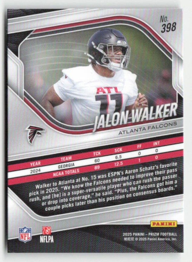 You are purchasing a 2025 Panini Prizm Jalon Walker #398 RC. You will receive the exact item in the photographs. Thank you for looking.