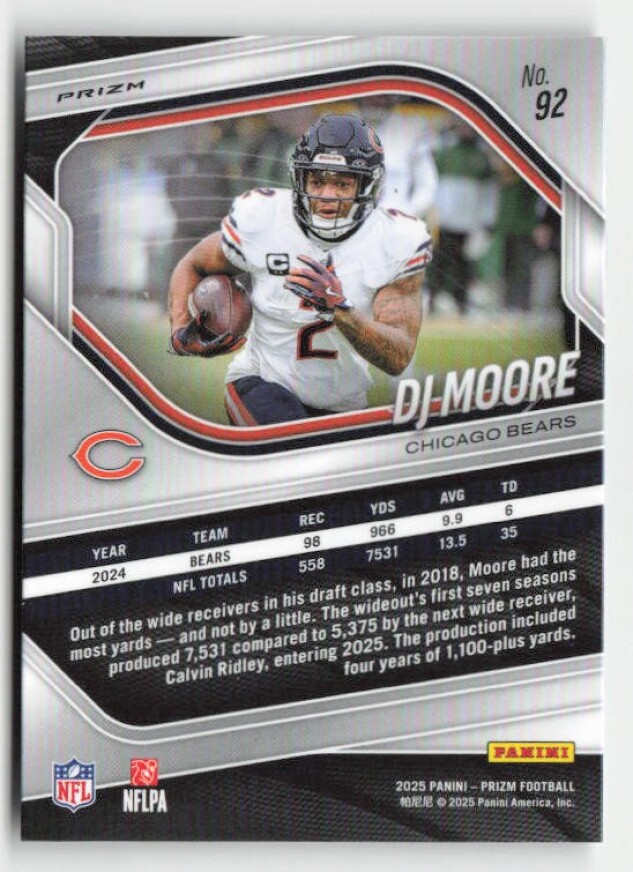 You are purchasing a 2025 Panini Prizm DJ Moore #92 Lazer. You will receive the exact item in the photographs. Thank you for looking.