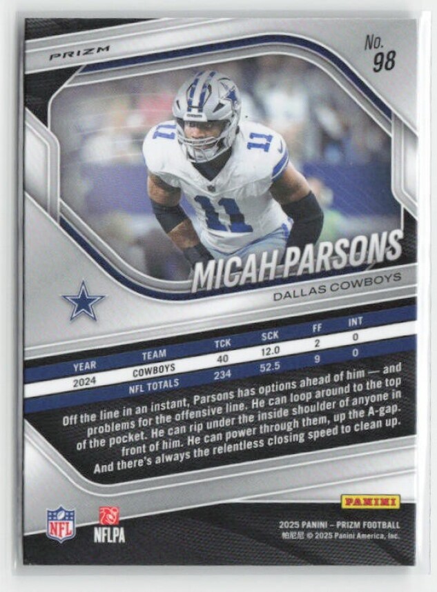 You are purchasing a 2025 Panini Prizm Micah Parsons #98 Silver. You will receive the exact item in the photographs. Thank you for looking.
