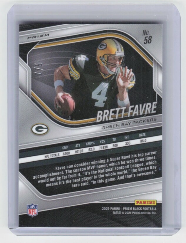 You are purchasing a 2025 Panini Prizm Black Brett Favre #58 Prizms Green Shimmer FOTL MATCH 5/7 LINE GOING DOWN BY FOOTBALL IS TOP LOADER CARD IS PRISTINE SN HOF 2016 SSP. You will receive the exact item in the photographs. Thank you for looking.