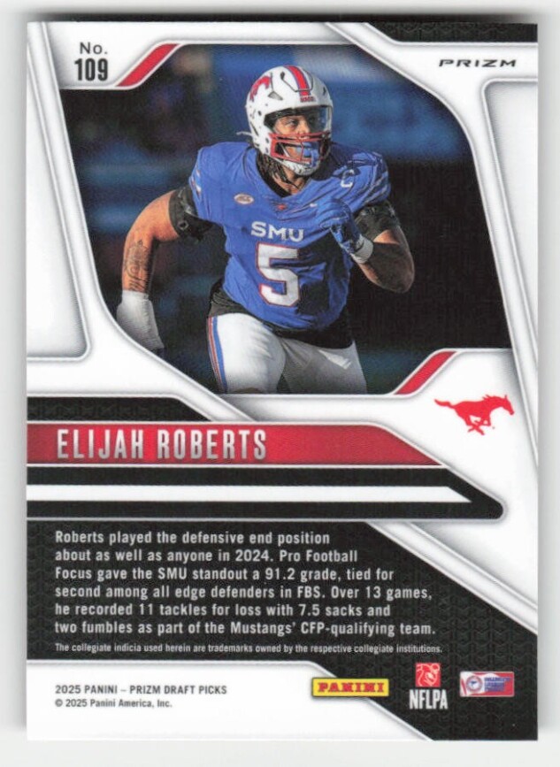 You are purchasing a 2025 Panini Prizm Draft Picks Elijah Roberts #109 Prizms Red Ice. You will receive the exact item in the photographs. Thank you for looking.