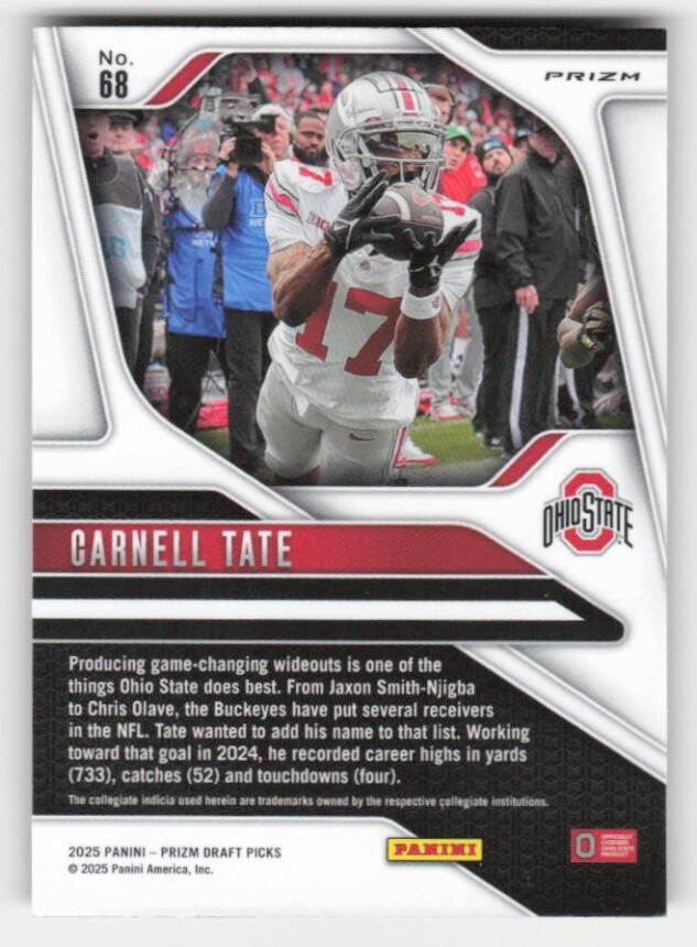 You are purchasing a 2025 Panini Prizm Draft Picks Carnell Tate #68 Prizms Red Ice. You will receive the exact item in the photographs. Thank you for looking.