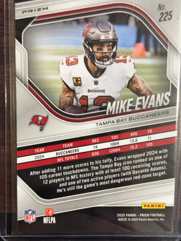 You are purchasing a 2025 Panini Prizm Mike Evans #225 White Sparkle. You will receive the exact item in the photographs. Thank you for looking.