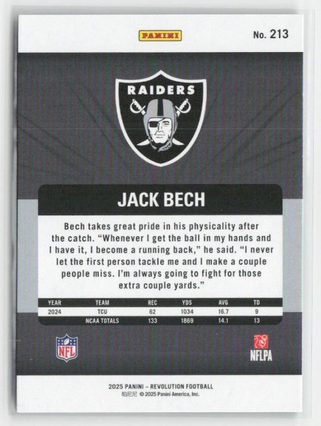 You are purchasing a 2025 Panini Revolution Jack Bech #213 RC. You will receive the exact item in the photographs. Thank you for looking.