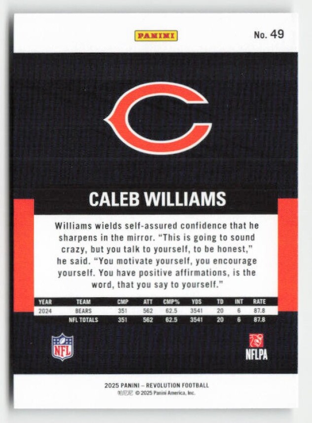 You are purchasing a 2025 Panini Revolution Caleb Williams #49. You will receive the exact item in the photographs. Thank you for looking.