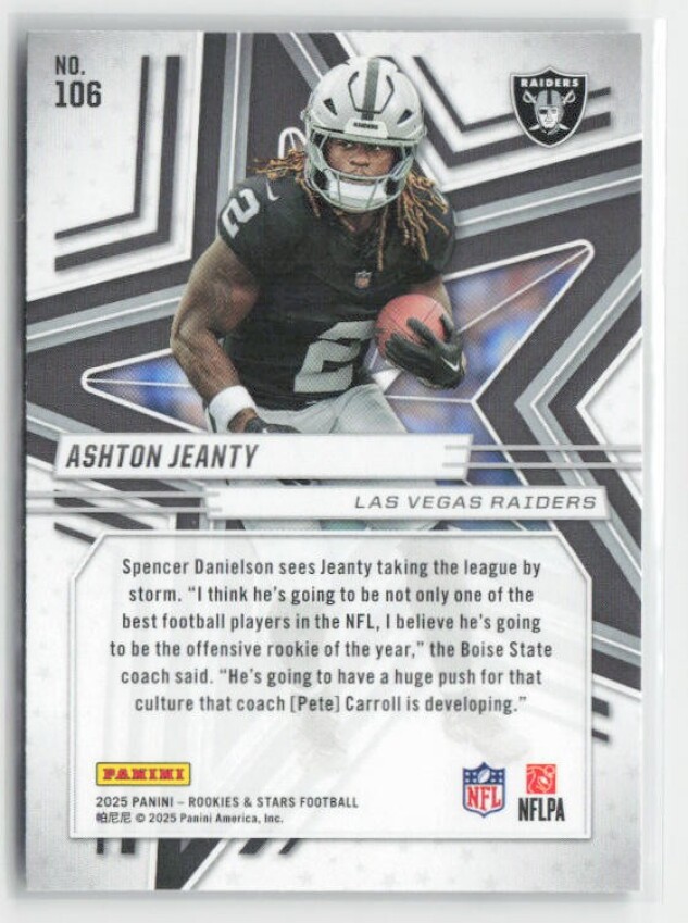 You are purchasing a 2025 Panini Rookies & Stars Ashton Jeanty #106 RC. You will receive the exact item in the photographs. Thank you for looking.