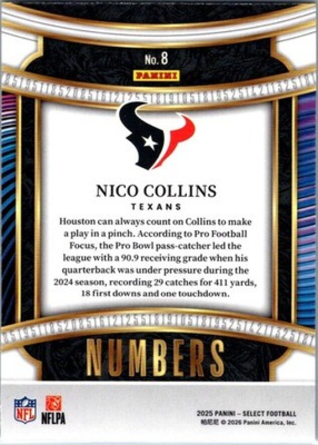 This is a nice example of a 2025 Panini Select #8 Nico Collins Select Numbers