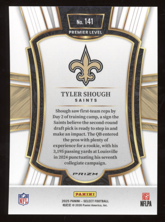 You are purchasing a 2025 Panini Select Football Tyler Shough #141 Disco Prizm RC. You will receive the exact item in the photographs. Thank you for looking.