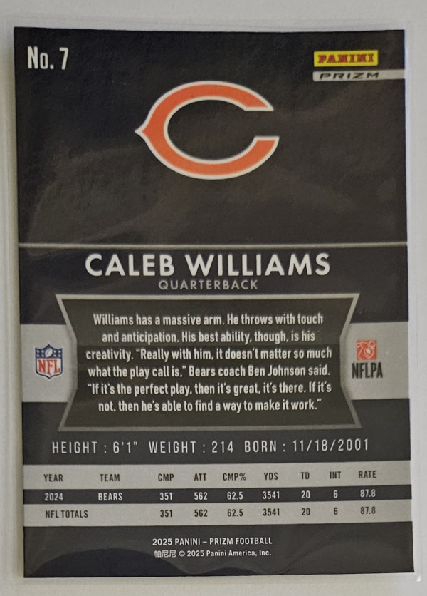 2025 Flashback Prizm Caleb Williams #7. *Card will ship in protective sleeves and a cardboard box, I do not ship using PWE or BM.