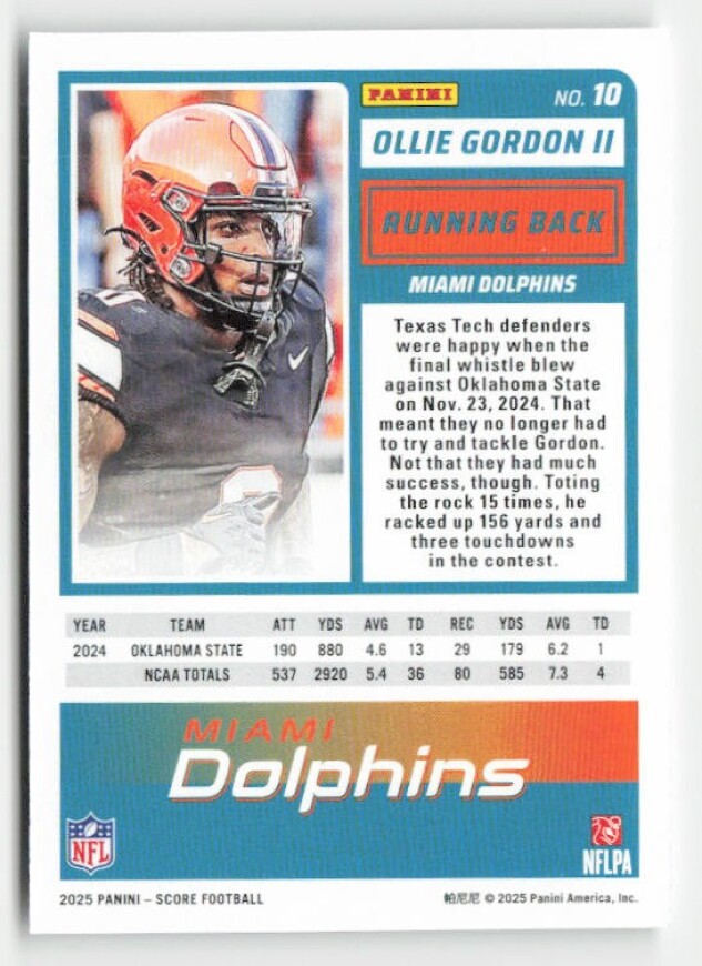 You are purchasing a 2025 Score Ollie Gordon II #10 RC. You will receive the exact item in the photographs. Thank you for looking.