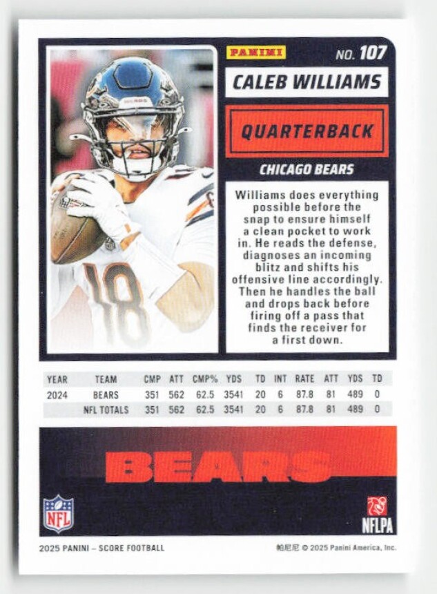 You are purchasing a 2025 Score Caleb Williams #107. You will receive the exact item in the photographs. Thank you for looking.