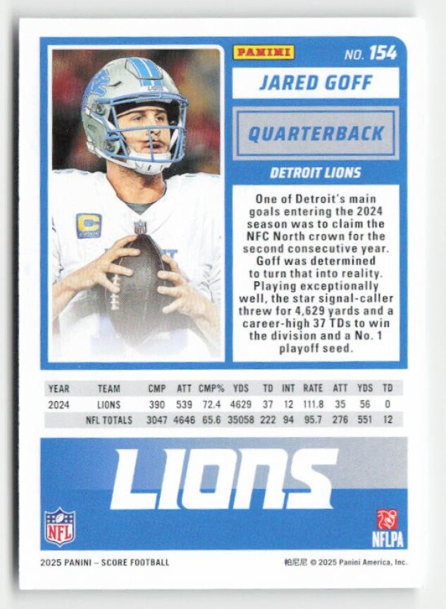You are purchasing a 2025 Score Jared Goff #154 Green. You will receive the exact item in the photographs. Thank you for looking.