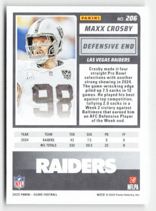 You are purchasing a 2025 Score Maxx Crosby #206. You will receive the exact item in the photographs. Thank you for looking.