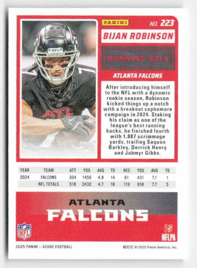 You are purchasing a 2025 Score Bijan Robinson #223 Red. You will receive the exact item in the photographs. Thank you for looking.