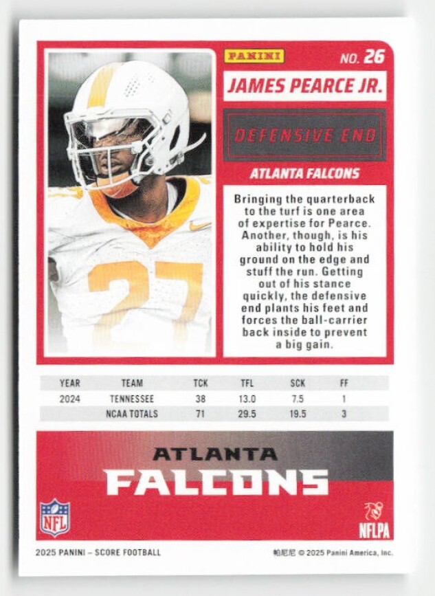 You are purchasing a 2025 Score James Pearce Jr. #26 RC. You will receive the exact item in the photographs. Thank you for looking.